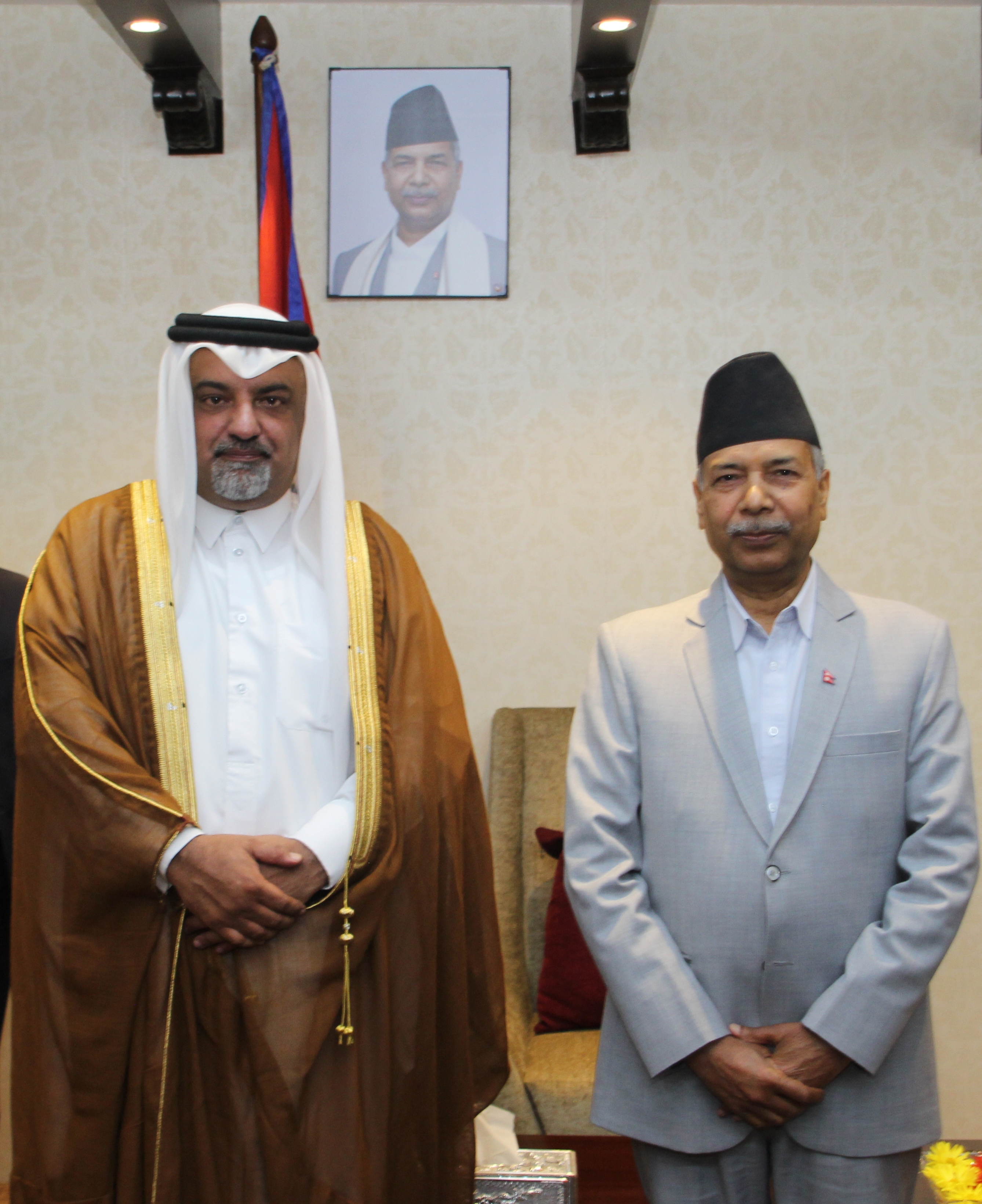 सम्माननीय उपराष्ट्रपतिज्यूसंग कतारका महामहिम राजदूत H.E. Mishal Mohammed Al Ansari को शिष्टाचार भेट मिति २०८२।०८।२४