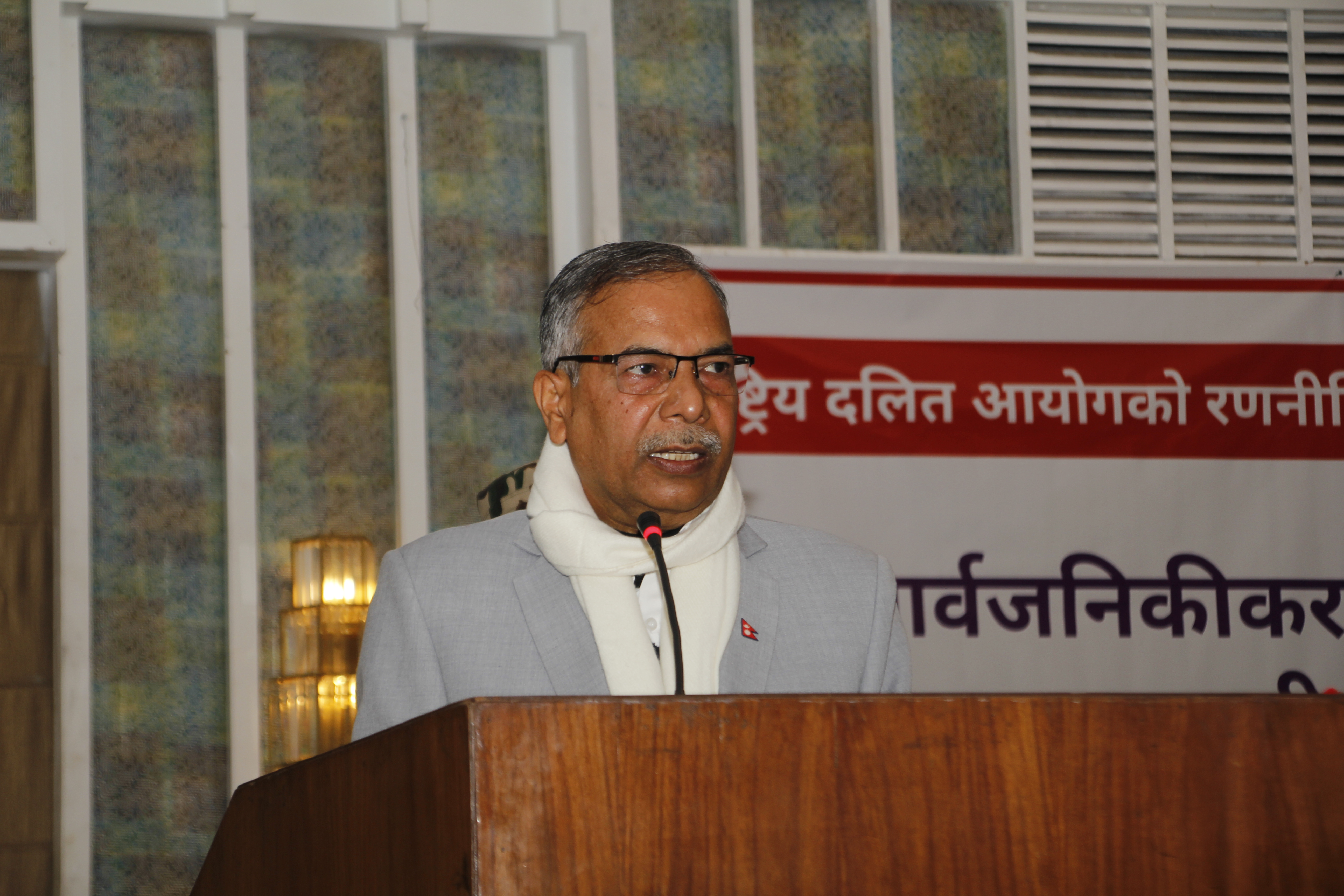 सम्माननीय उपराष्ट्रपति श्री रामसहाय प्रसाद यादवज्यूद्वारा राष्ट्रिय दलित आयोगद्वारा आयोजित ‘पञ्चवर्षीय रणनीतिक योजना २०८२–२०८७’तथा ‘नयाँ उजूरी व्यवस्थापन प्रणाली’सार्वजनिकरण समारोहमा सम्बोधन गर्नु हुदै। मिति: २०८२ पुस १४