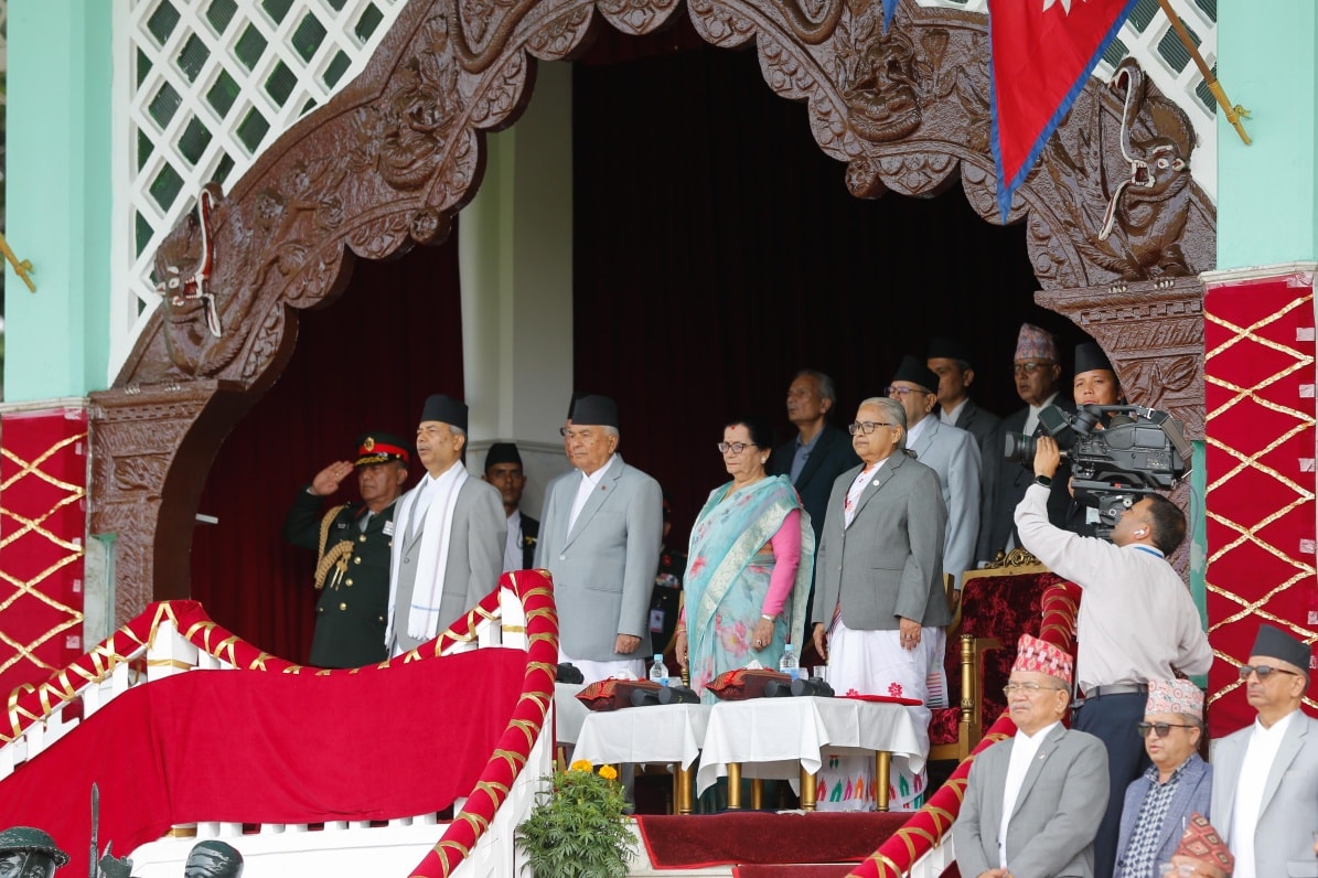 काठमाडौँको टुँडिखेलमा संविधान दिवस तथा राष्ट्रिय दिवसको अवसरमा २०८२ असोज ३ गते शुक्रबार आयोजित विशेष समारोहमा सम्माननीय राष्ट्रपति रामचन्द्र पौडेलज्यू, सम्माननीय उपराष्ट्रपति रामसहाय प्रसाद यादवज्यू , सम्माननीय प्रधानमन्त्री सुशीला कार्कीज्यू लगायतका सहभागीहरु ।